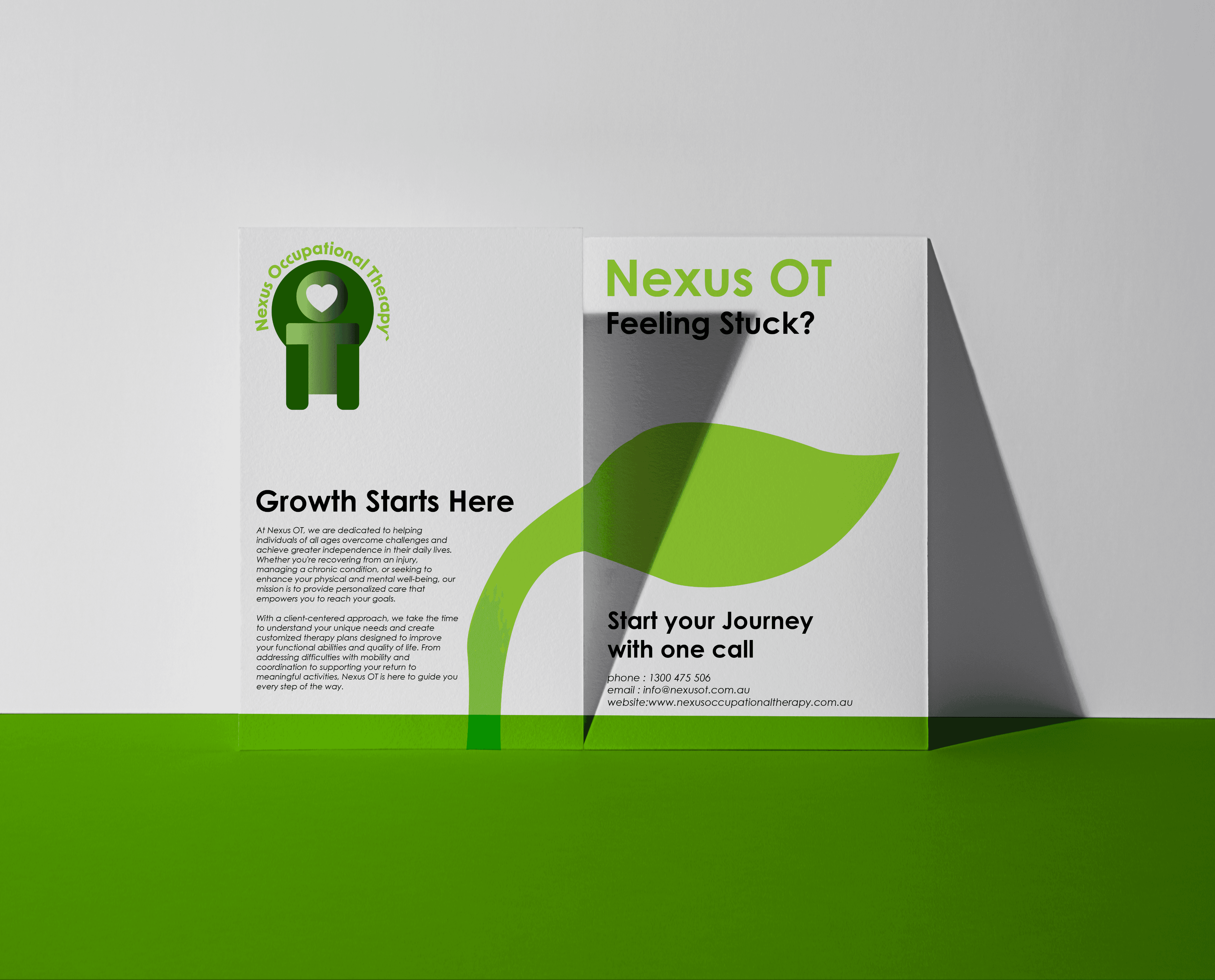 The aim of this brand is to provide expert treatment to development issues and rehabilitation to all ages. This professional, yet welcoming nature is emphasised through concise imagery and clear natural parallel. A fully green pallet and environmental imagery throughout is used to call on a connection between the advantages of Occupational Therapy and natural growth ana prosperity. Paired with modern legible designs and typography, a clear and recognizable identity forms.